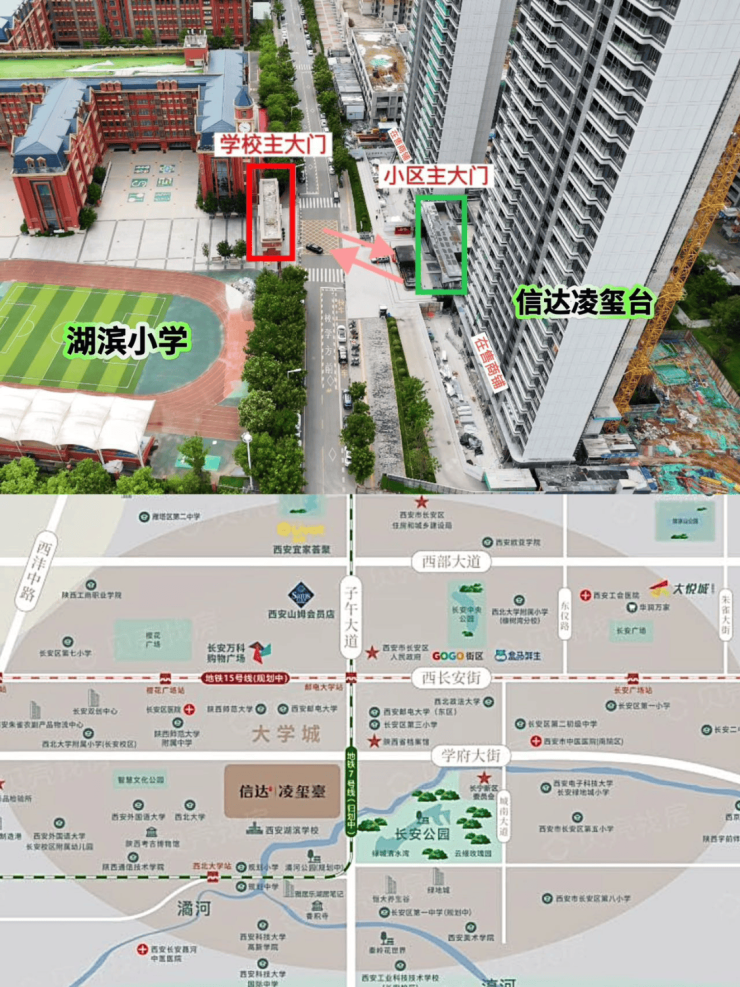 项目地处西安铁一中湖滨校区主门正对面(12 年制高校,师生总人数 8000+,每日稳定 10000+ 自然客流),铁一湖滨小学、初中、高中(管理体系延袭铁一中,西安五大金字招牌名校之一)及社区自带 36 班幼儿园四所学校包围,6W+ 师生、家长消费群体,周边 2 公里陕西师范大学、西安邮电大学、西北大学、西北政法大学、西安外国语大学,长安三小 6 大名校环绕。