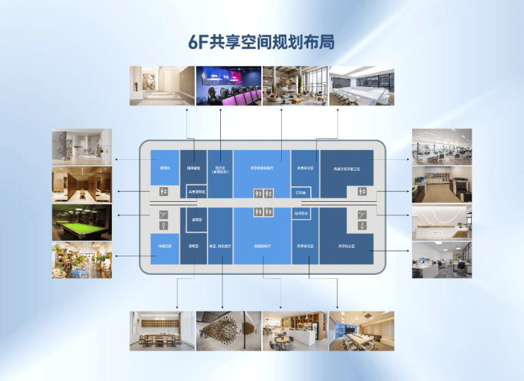 6层为共享空间,涵盖共享办公,影音、休闲娱乐、轻咖简餐等休闲、办公空间;完善商业生态链,超越同类产品,成为商业增值亮点