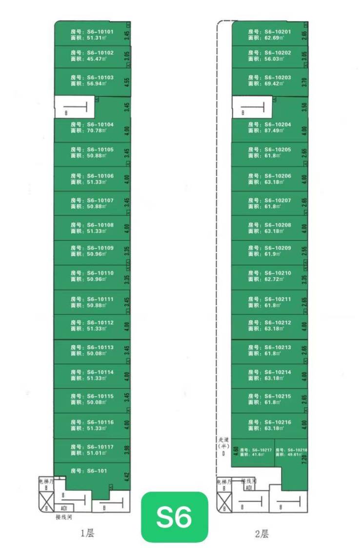 一层 :层高6米,50套 ,面积区间:38-100平